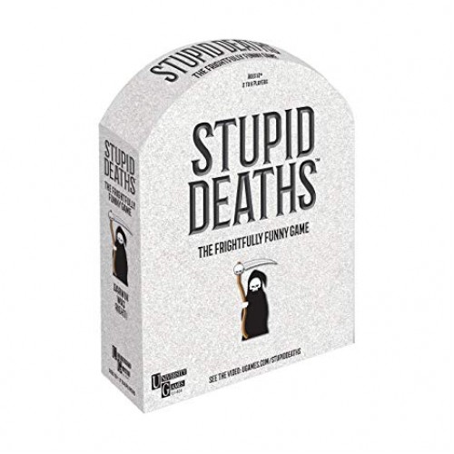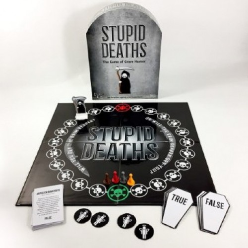 Here lies Stupid Deaths, a frightfully funny, family board game! This game celebrates some of the stupidest deaths over the centuries and players will die laughing as they are chased around the game board by the Grim Reaper! The question is just how did these people meet their end? Players advance around the board by working out whether the implausible, and sometimes rather amusing, demise is true or false. Players start the game with a True and a False Voting Card as well as an Extra Life Token. All the players begin on the Green space, half way around the board from the Red space where the Grim Reaper starts his chase. The first player takes the top Stupid Deaths Cards and reads it aloud, individually all the other players have to decide if the scenario is real or made up and turn over either their True or False Voting card. Each player who has voted correctly moves their player piece one space closer to home and away from the chasing Grim Reaper. For each player who voted incorrectly the player must move the Grim Reaper one space forward towards their own piece! When the Grim Reaper catches up, lands or passes a play piece, that player has been ‘touched by death’ and is out of the game unless they use their Extra Life Token to give them one more chance. It’s a race against Death to be the first player home and reach the Red space!